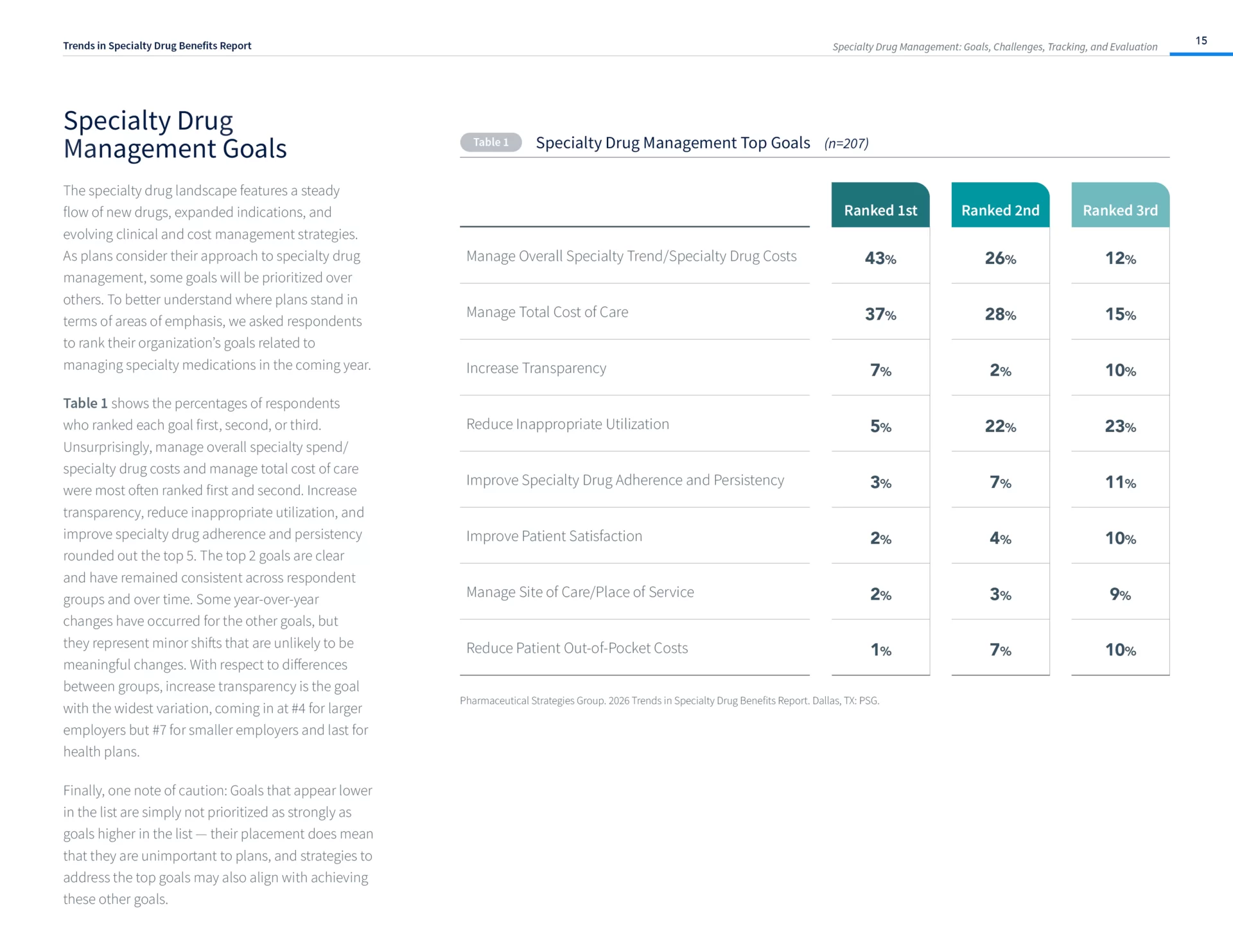 - Managing overall specialty drug trend/costs and managing total cost of care continue to be selected as top goals for the vast majority of payers.