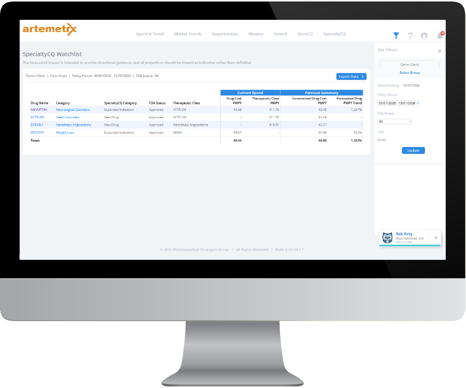 Artemetrx SpecialtyCQ™ provides healthcare payers with precise insights to confidently forecast, manage, and control specialty drug spending. By utilizing the plan’s own integrated pharmacy and medical claims data, Artemetrx SpecialtyCQ streamlines specialty drug trend management and supports informed decision-making for future financial planning.